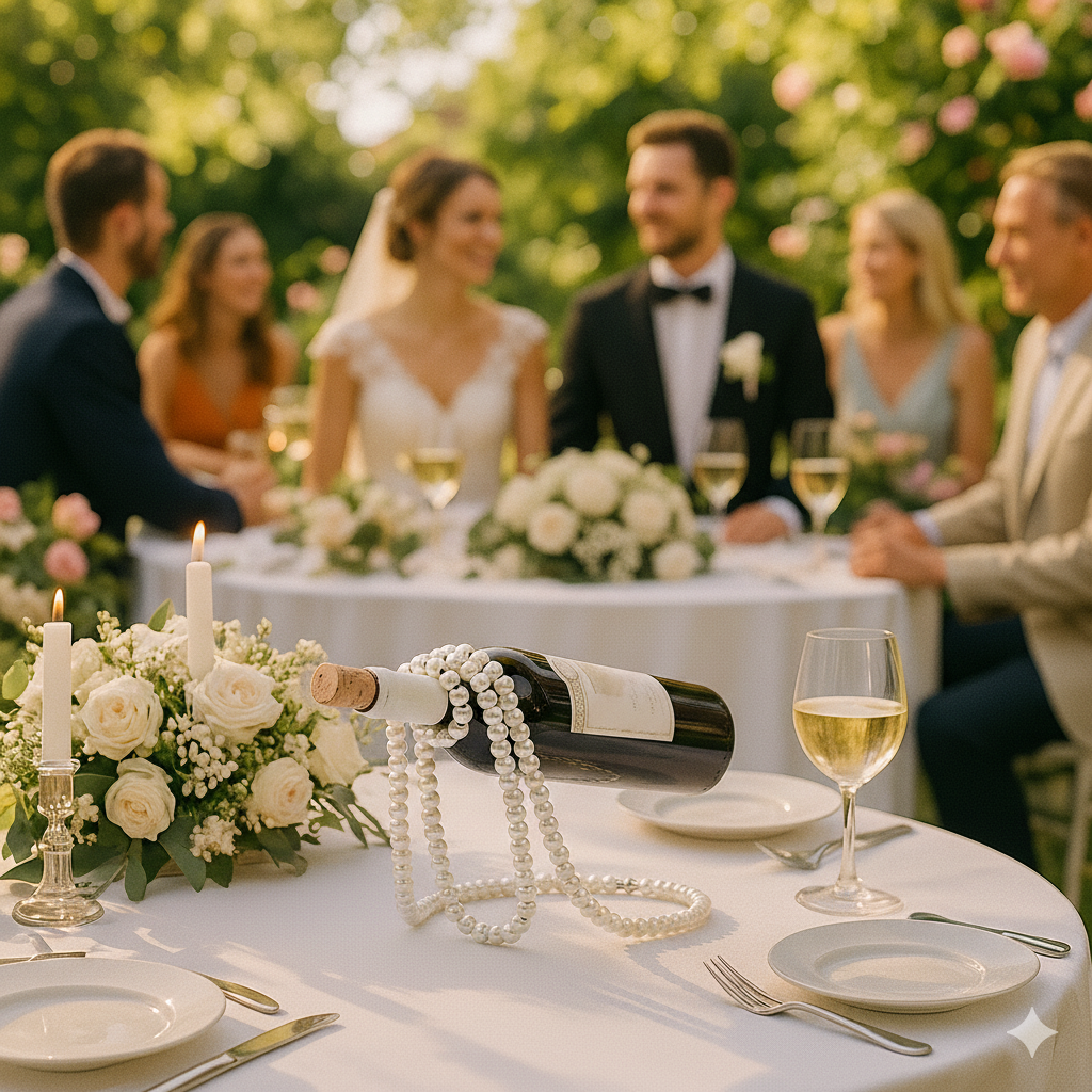 Ce support unique donne l’illusion que votre bouteille lévite, suspendue par un délicat collier de perles blanches — un effet visuel bluffant qui ne passe jamais inaperçu.